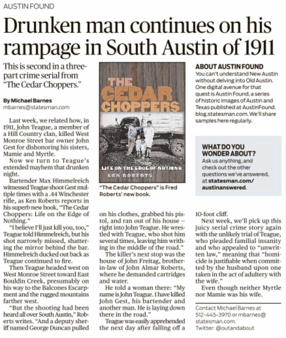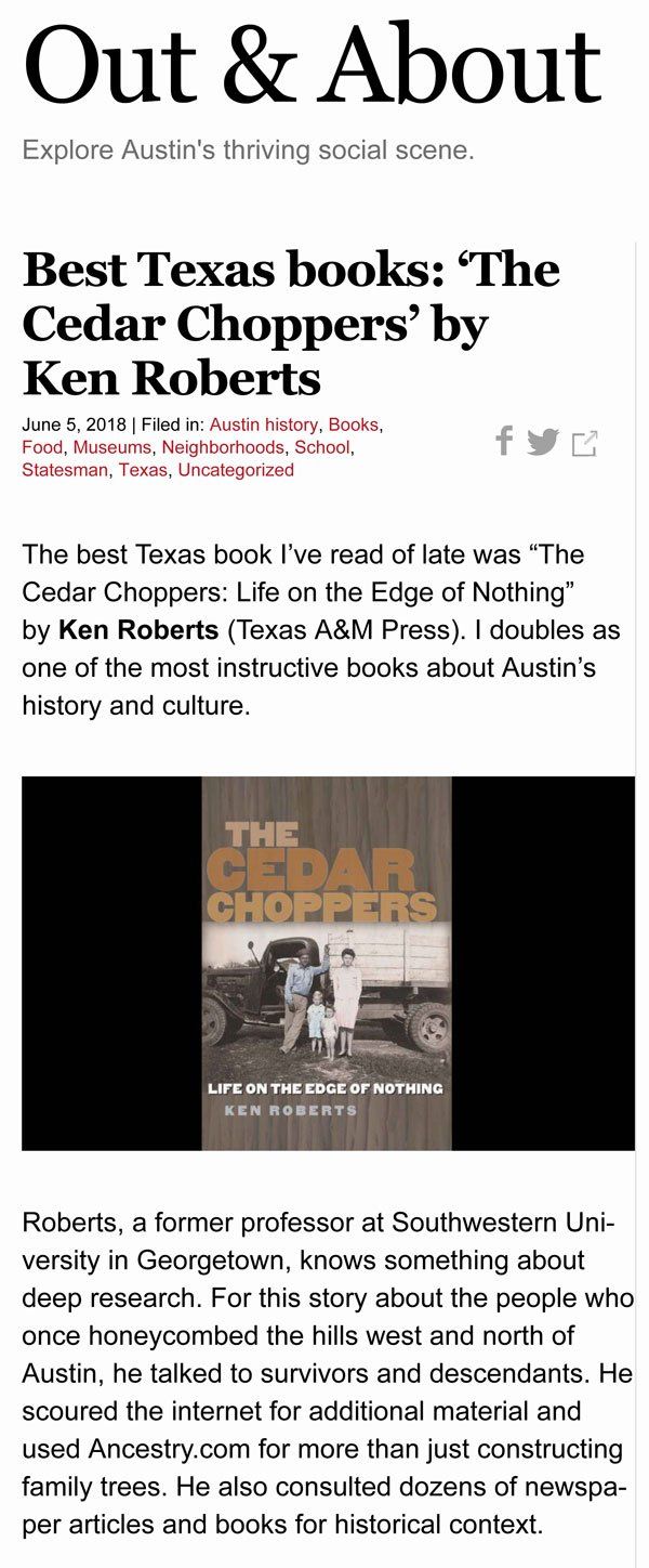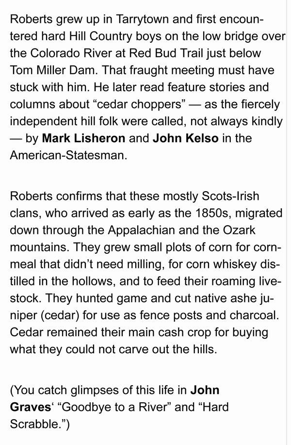 "Five years in the making, Roberts’ book is fascinating study of these little-known Texas hillbillies, whose way of life faded with the arrival of the steel fence post, the extended drought of the 1950s and the relentless encroachment of urbanites on their domain."
